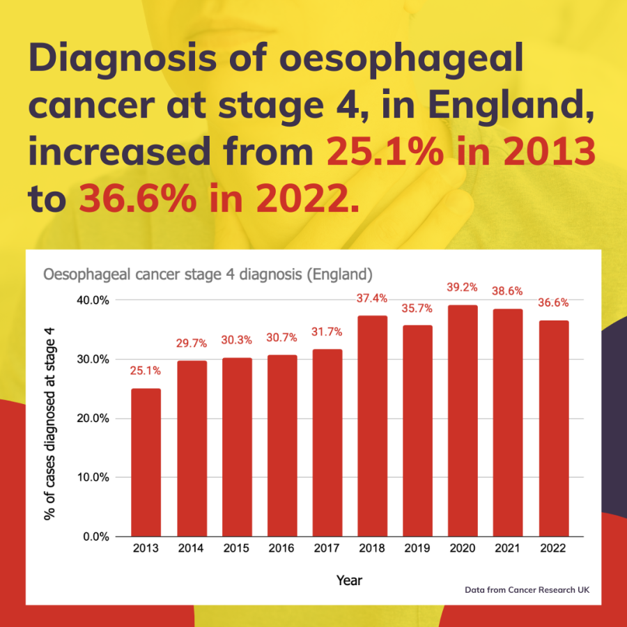 The proportion of oesophageal cancer cases diagnosed at stage 4 has risen from around a quarter to just over a third of all cases, over the course of a decade. This rise in late-stage diagnosis is catastrophic for patient survival.